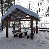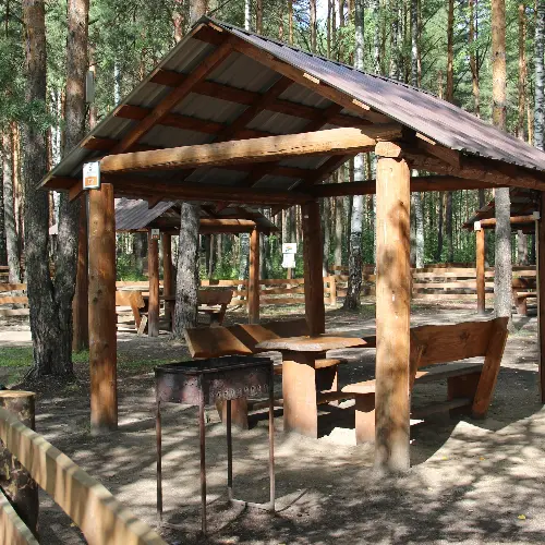 Средняя беседка. Комфортный деревянный стол и лавки из бревен. Удобный большой мангал. Освещение. Электричество
