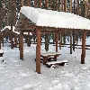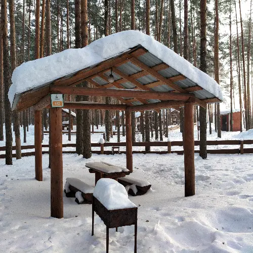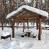 Маленькая беседка. Комфортный деревянный стол и лавки из бревен. Удобный большой мангал. Освещение. Электричество