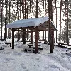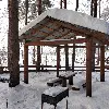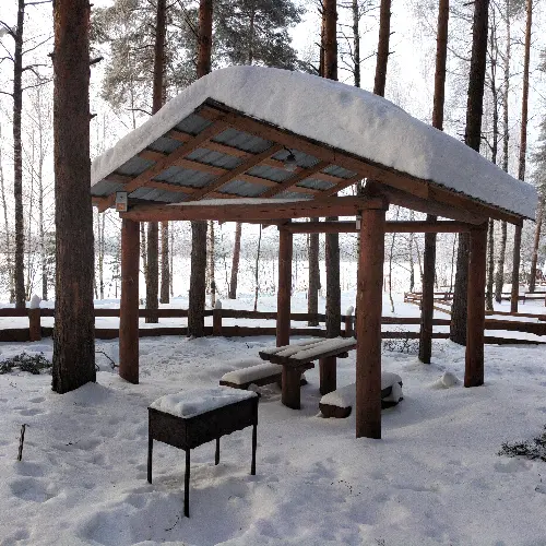 ММаленькая беседка. Комфортный деревянный стол и лавки из бревен. Удобный большой мангал. Освещение. Электричество