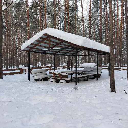 Крытый навес. Комфортный деревянный стол и лавки из бревен. Удобный большой мангал с разделочным столом. Освещение. Костровое место. Индивидуальная огороженная территория