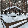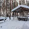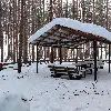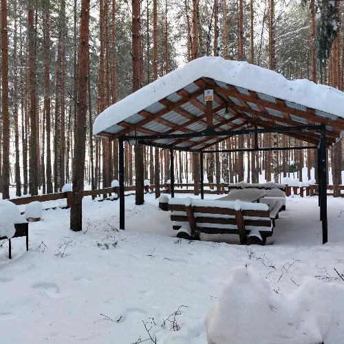 Крытый навес. Комфортный деревянный стол и лавки из бревен. Удобный большой мангал с разделочным столом. Освещение. Костровое место. Индивидуальная огороженная территория